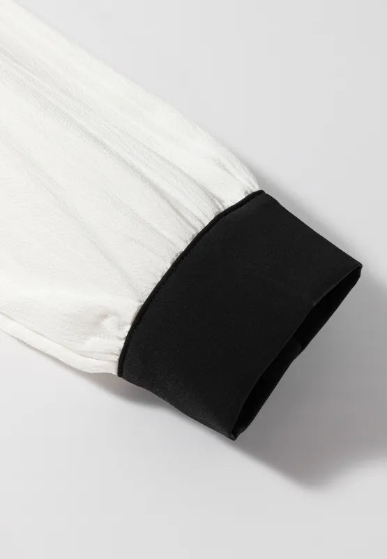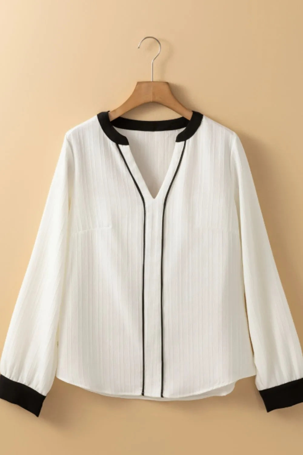 Add a fun twist to your wardrobe with our Contrast Notched Long Sleeve Blouse. Featuring eye-catching contrast details and a playful notched neckline, this blouse brings charm and flair to your everyday look. Its long sleeves offer comfort and versatility, perfect for mixing and matching with your favorite jeans or skirts. Elevate your style with a piece that's as lively and unique as you are!